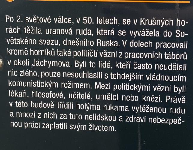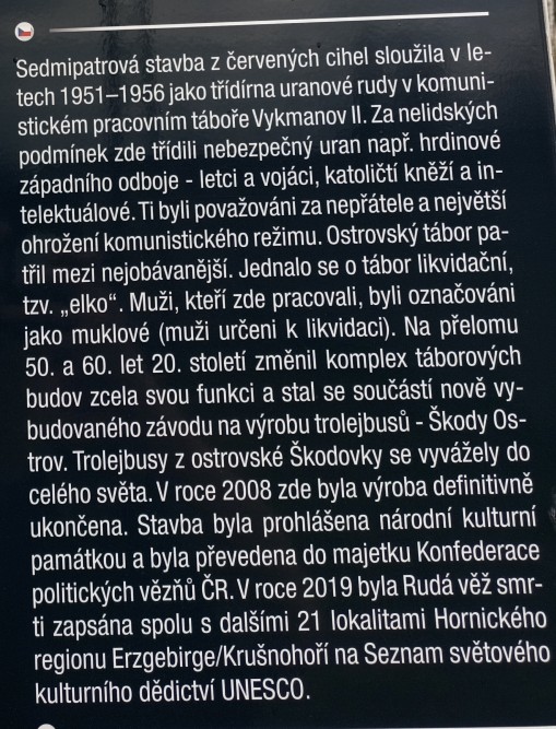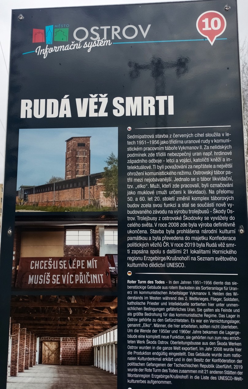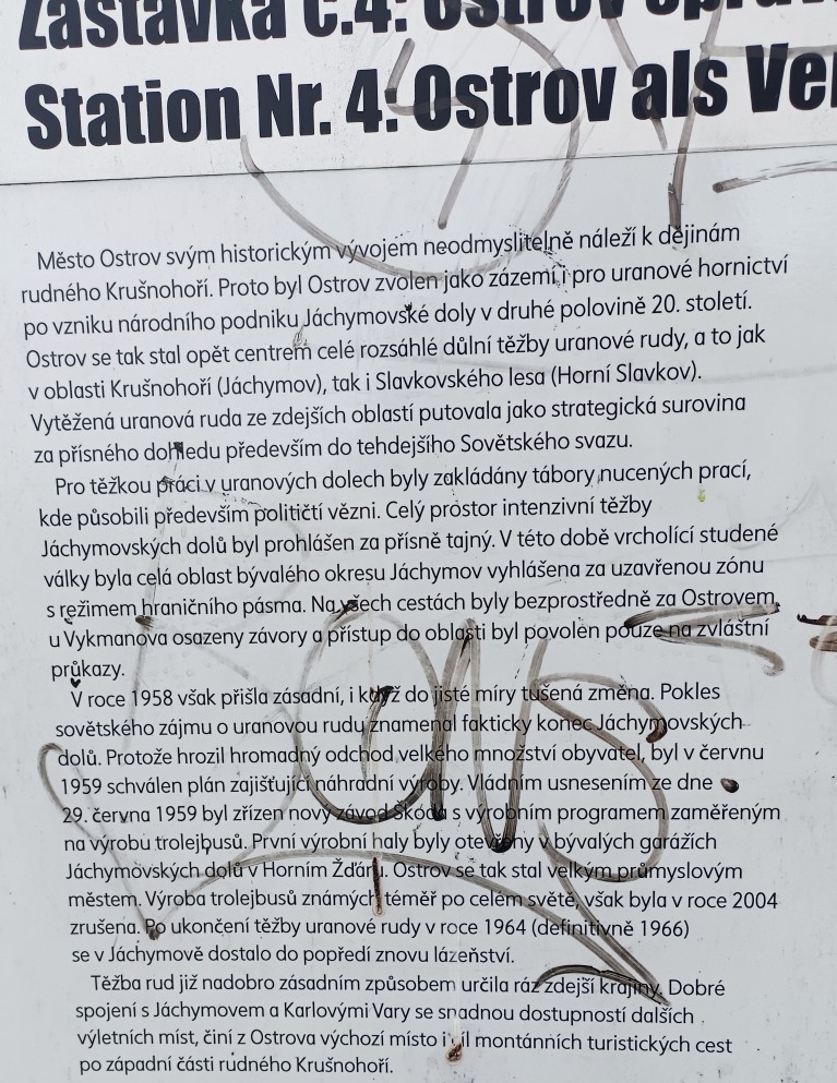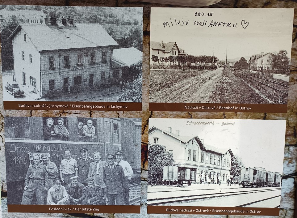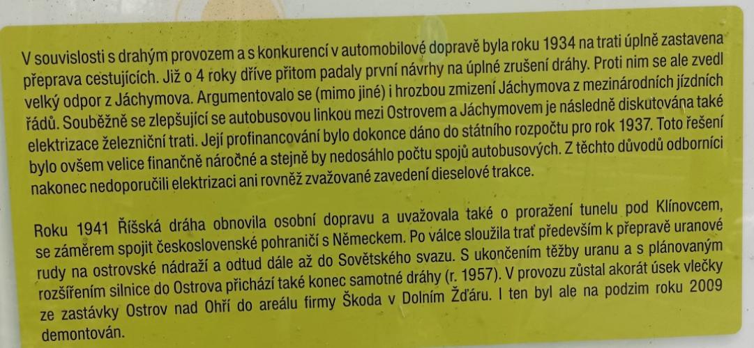 10:46 Kryté dřevěné schodiště  10:46 Kryté dřevěné schodiště  10:50 Důl Svornost  10:50 Důl Svornost  10:52 Štola č. 1  10:54  10:58 Důl Svornost  11:02 Štola č. 1  11:06 výhled na Jáchymov  11:07  11:07 Mauthausenské schody_Částečná replika příkrého schodiště, po kterém se v 50. letech 20. století vězni přesouvali mezi dolem Svornost a stejnojmenným pracovním táborem umístěným o 60 výškových metrů výše  11:10 Mauthausenské schody_Částečná replika příkrého schodiště, po kterém se v 50. letech 20. století vězni přesouvali mezi dolem Svornost a stejnojmenným pracovním táborem umístěným o 60 výškových metrů výše  11:10 Pracovní tábor Svornost  11:10 Pracovní tábor Svornost  11:24  11:31 Věž Prachárna  11:32 Věž Prachárna  11:33 Zřícenina hradu Freudenstein (Šlikův hrádek)  12:03  12:08  12:11 u domova pro seniory  12:18  12:26  12:46 Jáchymov_ulice K lanovce_najdi ZTZ  12:46 Jáchymov_ulice K lanovce_najdi ZTZ  12:55  12:57 Jáchymov_pohled od býv.nádraží  13:13 trať  13:17 Jáchymovský tunel  Jáchymovský tunel  13:29  13:47 Bývalá železniční stanice Horní Žďár  13:47 Bývalá železniční stanice Horní Žďár  13:49 Kamenný železniční mostek  13:49 Kamenný železniční mostek  14:06 Bývalá továrna na trolejbusy, závod Škoda Ostrov  14:06 Bývalá továrna na trolejbusy, závod Škoda Ostrov  spoje do Škodovky  14:08 Bývalá továrna na trolejbusy, závod Škoda Ostrov  14:16  14:24 Bývalá továrna na trolejbusy-závod Škoda Ostrov  14:36 Rudá věž smrti  14:36 Rudá věž smrti  Rudá věž smrti  14:37 Rudá věž smrti  14:37 Rudá věž smrti  14:47 Dolní Žďár  15:01 Dolní Žďár_těleso dráhy  15:03 Ostrov_těleso dráhy  15:14 Ostrov_těleso dráhy  15:14 Ostrov  15:16 Ostrov_těleso dráhy  pozdní oběd  15:51 Ostrov_býv. zastávka  15:52 Ostrov_býv. zastávka  15:59 zámecký park  15:59 zámecký park  16:00  16:02 Staré nám.  16:02 Staré nám.  16:15 zámecký park  16:25 zámecký park  16:26 zámecký park  16:26 zámecký park |