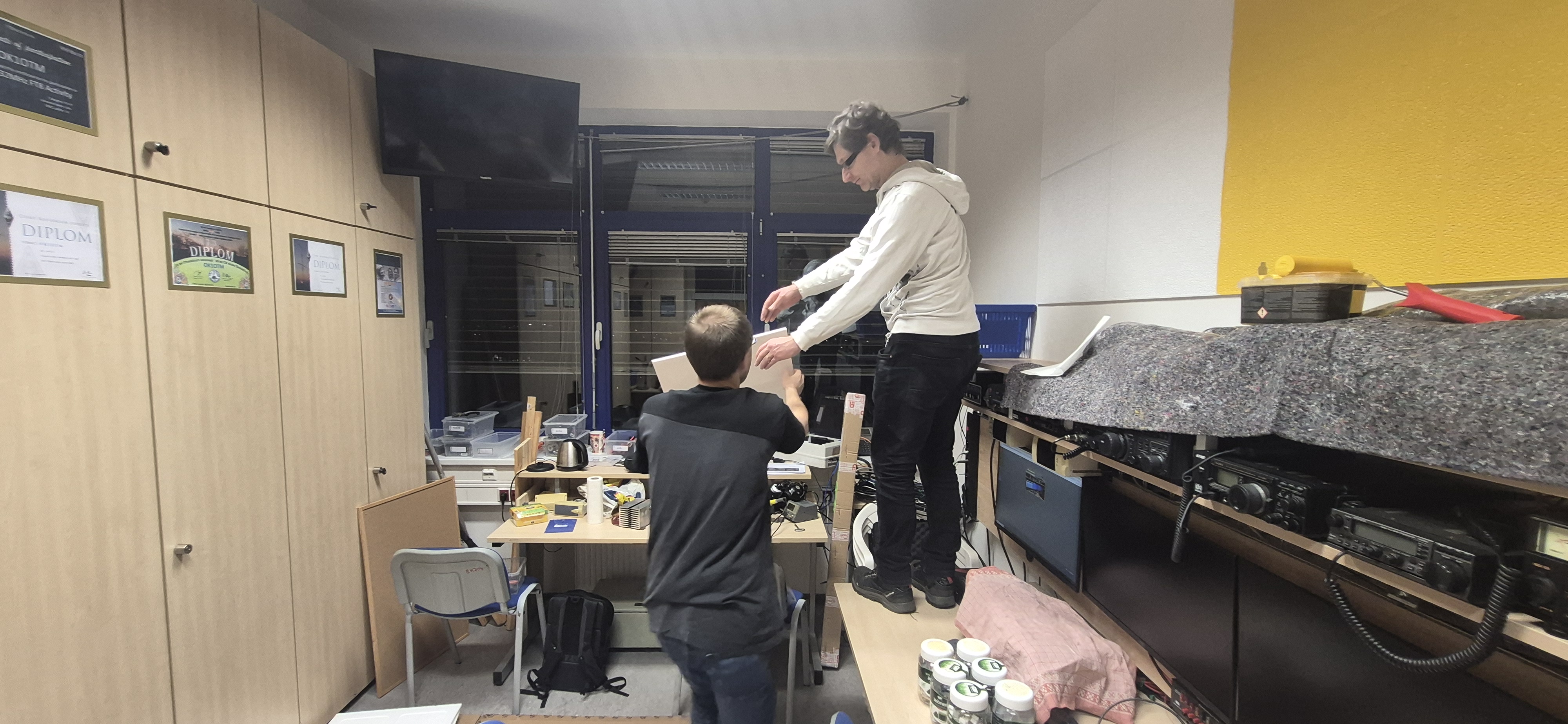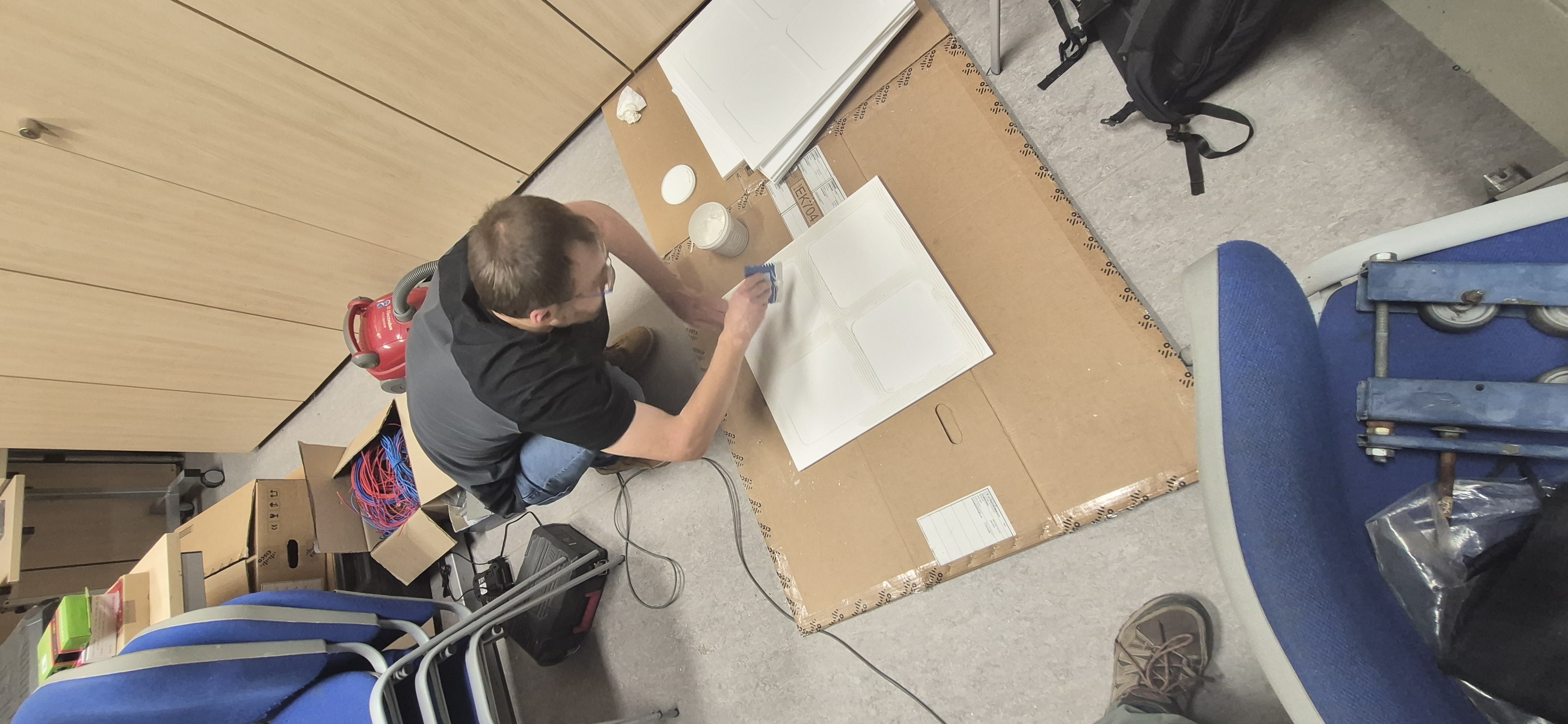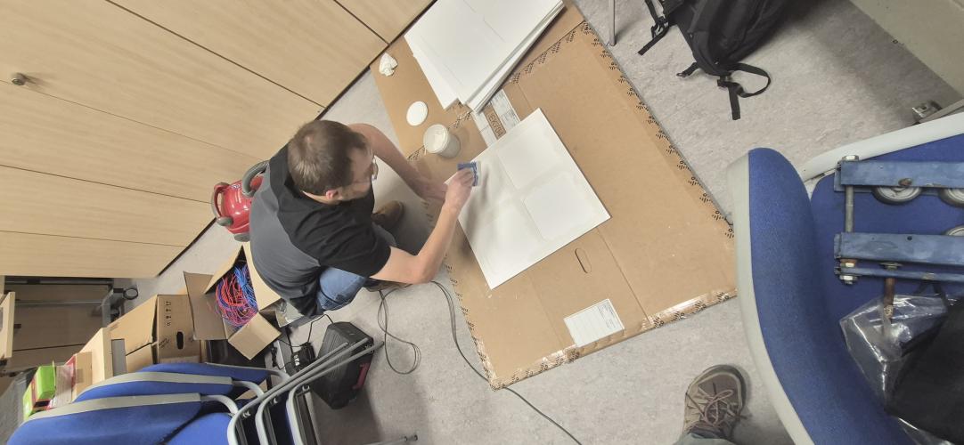 Michal přivezl druhý kyblík lepidla a vzápětí se i on pustil do práce.